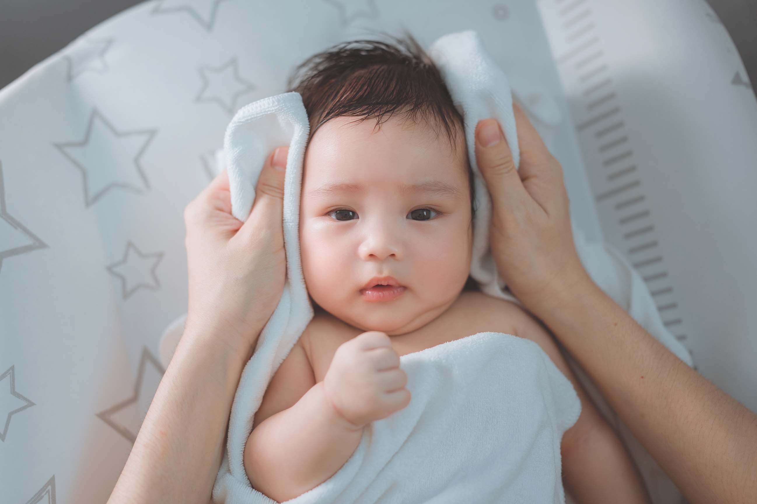 ရေခြောက်အောင် နူးနူးညံ့ညံ့သုတ်ပေးပါ။ ရေချိုးပြီးတာနဲ့ စိုစွတ်နေတဲ့ ကလေးအသားရည်ကို မျက်နှာသုတ်ပဝါနဲ့ပဲ ညင်ညင်သာသာ ပုတ်ပြီး သုတ်ပေးဖို့လိုပါတယ်။ ကြမ်းကြမ်းတမ်းတမ်း ပွတ်ပြီး ရေသုတ်မယ်ဆို အသားယားတာ၊ ခြောက်တာတို့ ဖြစ်တတ်လို့ပါပဲ။