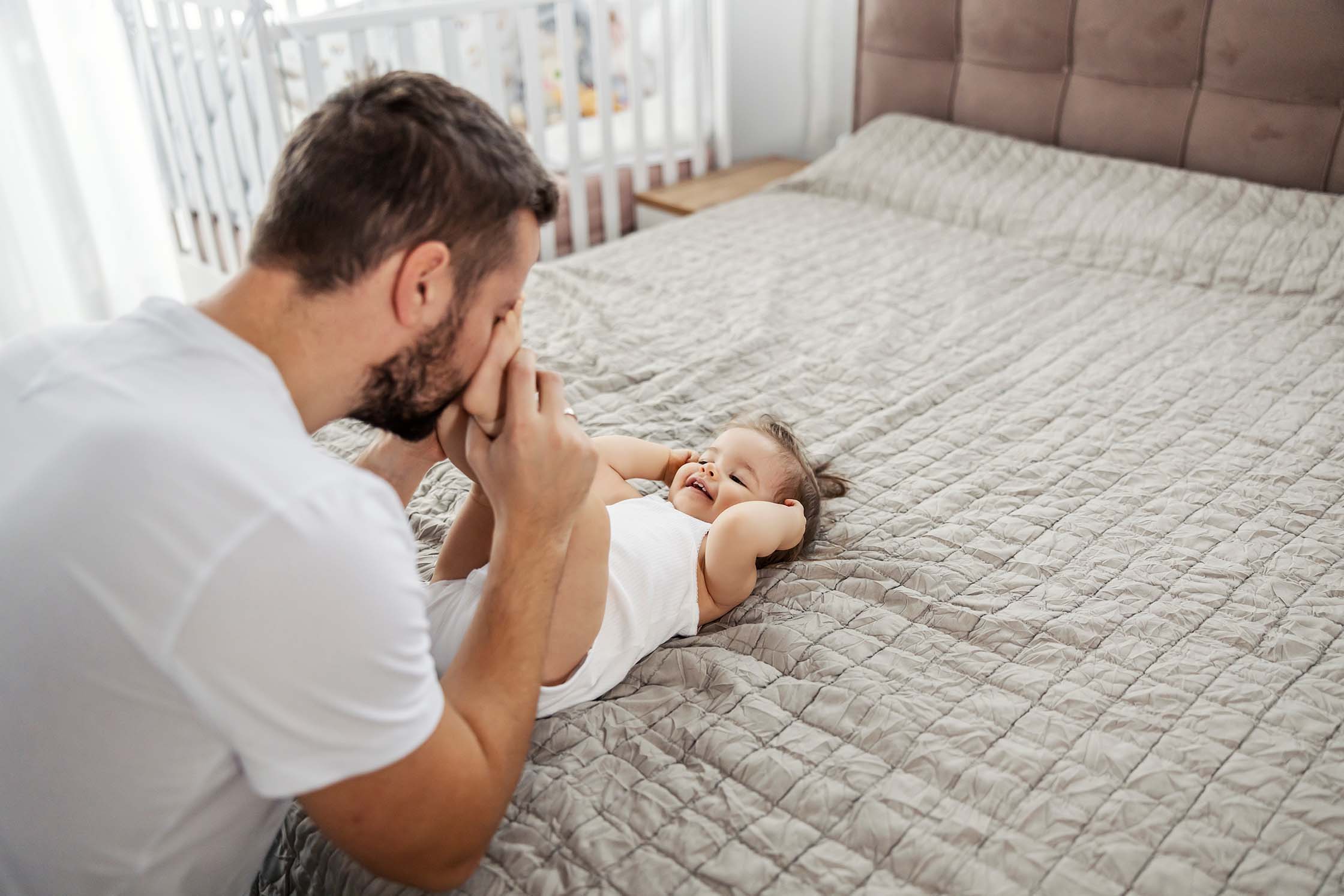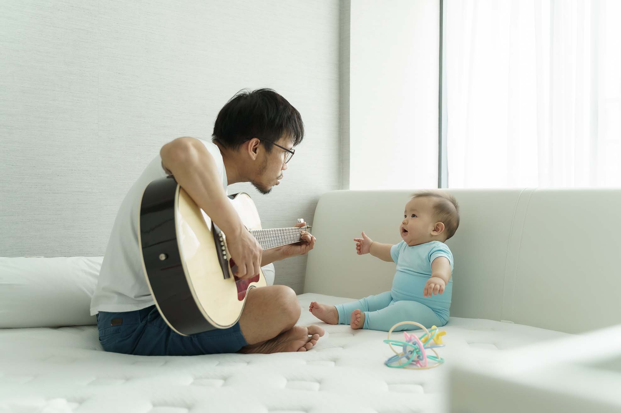 Playing with your baby by holding them close and chatting to encourage little coos and babbles, or lying on your back and lifting them onto your belly while talking to them, is a great way to strengthen eye contact and deepen your bond. It helps create more meaningful interactions and fosters closeness.