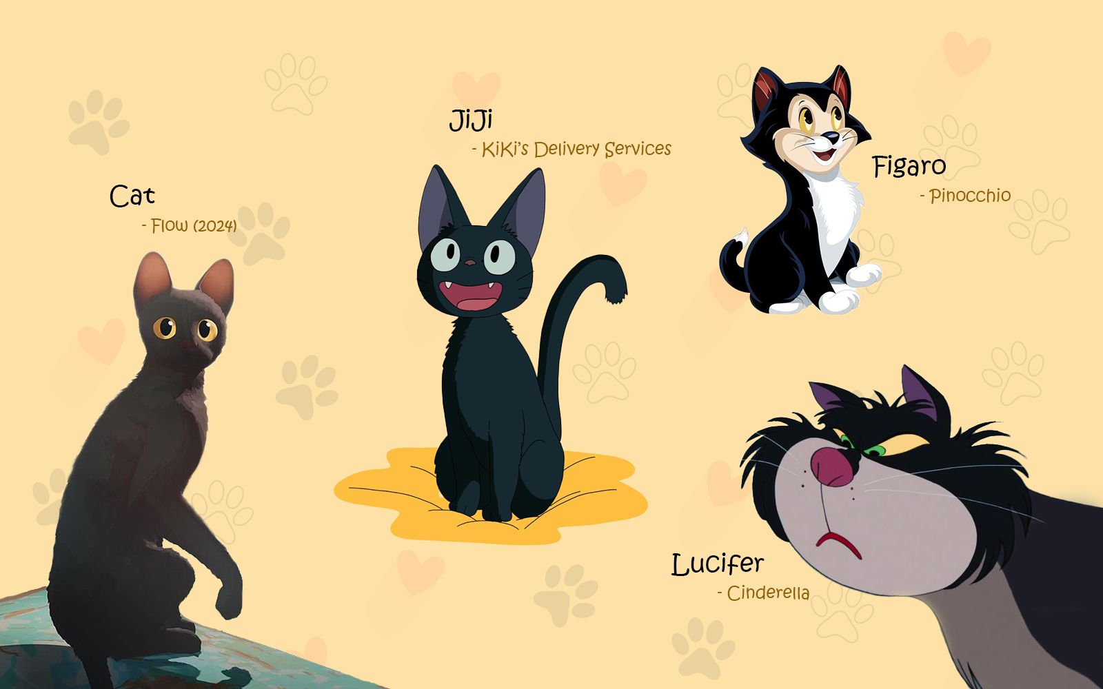 Some famous black cats in movies and stories include Figaro from Pinocchio, JiJi from Kiki’s Delivery Service, Lucifer from Cinderella, and the black cat in the Oscar-winning film Flow.